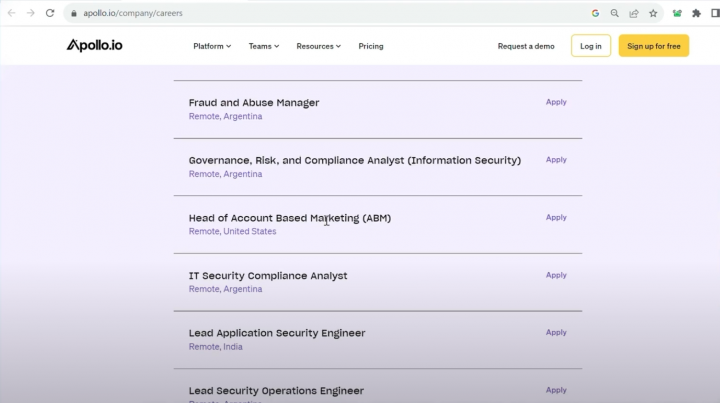 So looking at Apollo’s jobs posts, you can see that they have open jobs for SEO strategy, account management, security and compliance. These are probably areas that Apollo is focused on strategically.