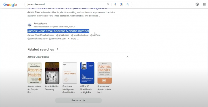 So if you search google for terms for like “Elon Musk’s Email” or “James Clear’s Email” a result for Rocket Reach appears.