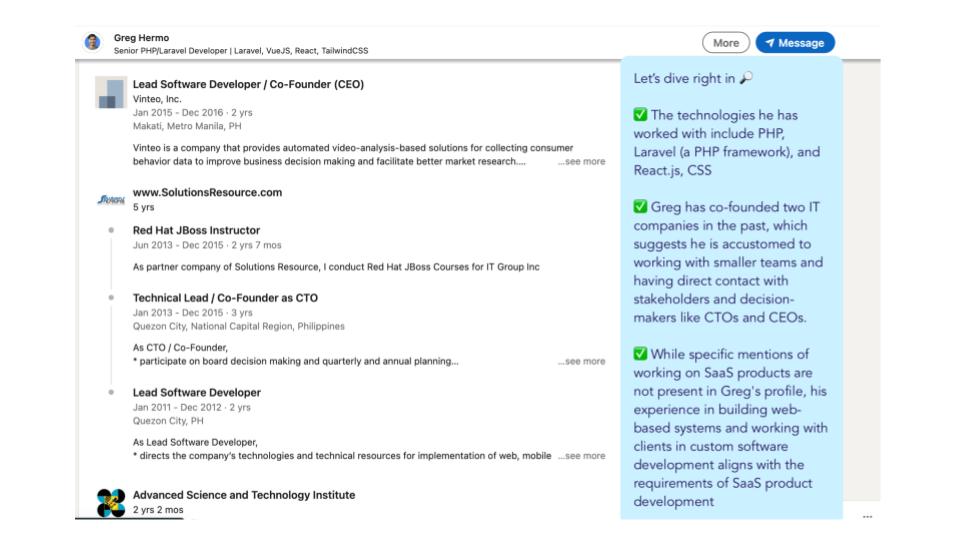 “tech lead” OR “senior developer” OR “team leader” “(React” OR “reactjs” AND “laravel)” AND “saas” -“contactout” -intitle:”profiles” -inurl:”dir/ ” site:ph.linkedin.com/in/ OR site:ph.linkedin.com/pub/