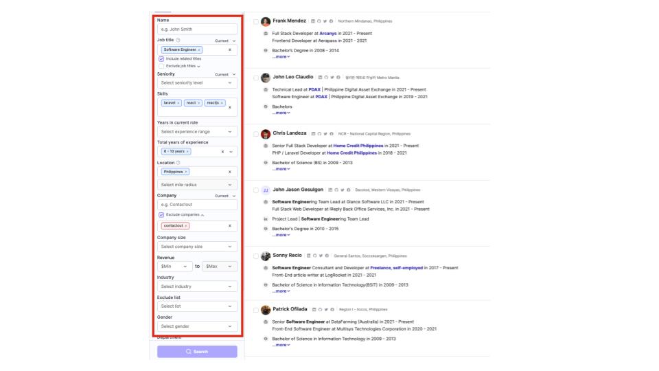 My go-to for sourcing is ContactOut, a contact-finding platform that scours through vast databases and filters candidates based on set parameters.