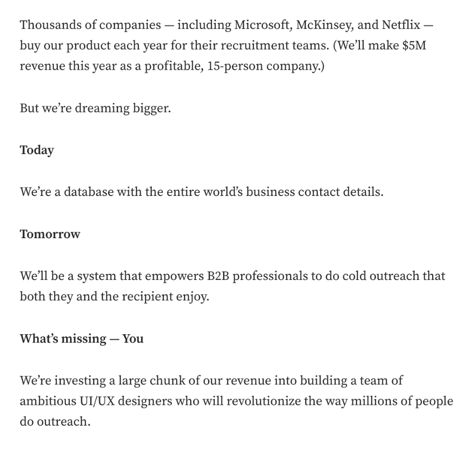 Whether it’s an intriguing introduction to your company or a compelling tagline, the opening should be enough to make applicants pause and take notice. For many startups, flaunting their venture-backed status is a common tactic.