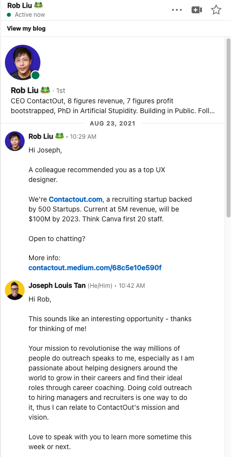 And here’s a screenshot of our CEO Rob’s first message to our Head of Product Design, Joseph over LinkedIn.