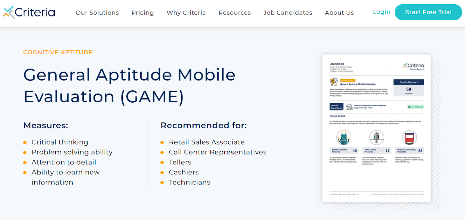 For instance, Criteria’s GAME (General Aptitude Mobile Evaluation) is a mobile-optimized test that measures critical thinking, problem-solving skills, attention to detail, and the capacity to absorb new data. These outcomes offer a glimpse into a candidate’s cognitive abilities, a significant indicator of potential job performance. Gamified evaluations lessen the stress candidates often feel during tests and foster a favorable impression, enhancing your company’s image.