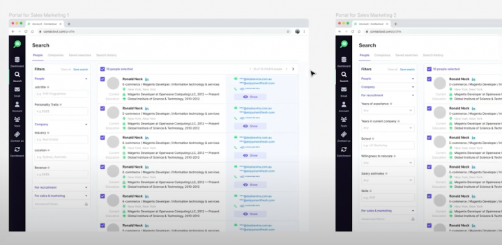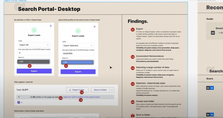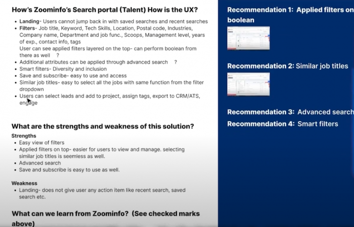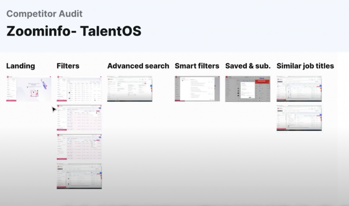 For example for Zoominfo, we would look at every screen and UX flow. The filters to the search, the save functionality, related profiles. We would assess the strengths, weaknesses, and would come up with recommendations.
