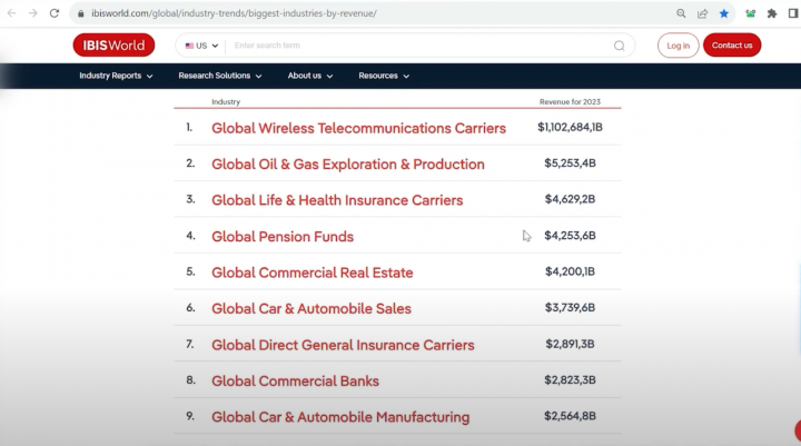 When actually, according to IbisWorld, the biggest industries globally are telecommunications, energy, insurance. real estate, automotive, banking, healthcare, hospitals, pharmaceuticals, as well as schools and universities.